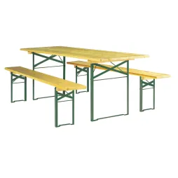 Les ensembles table et bancs pliants comme l’ensemble de brasserie Vienne composé d’une table et de 2 bancs, en pin massif vernis, disponible en plusieurs dimensions ; ou l’ensemble de brasserie Pragues composé d’une table et de 2 bancs d’une capacité de 6 à 8 personnes, permettent des aménagements rapides et simplifiés pour les événements en intérieur comme en extérieur.