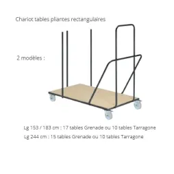 Pour transporter et véhiculer vos chaises et tables de collectivités, Leader Equipements vous propose sa sélection de chariot de transport de table, de chariot de rangement pour chaises pliantes et de diable pliable ou fixe. Conçu pour déplacer rapidement votre mobilier intérieur, le chariot de transport de table ou de chaise vous fait gagner un temps précieux et vous permet de mettre en place ou de ranger facilement votre installation. Profitez maintenant du meilleur rapport qualité/prix pour votre chariot de rangement pour chaises pliantes ou votre diable de transport grâce à votre fournisseur de mobilier urbain. Nous sommes à votre disposition pour répondre à toutes vos demandes et vous accompagner dans votre démarche d'achat. Réalisez votre devis en quelques minutes et profitez d'une livraison rapide pour votre chariot de transport de table.