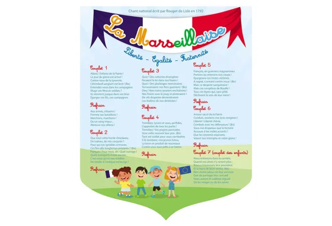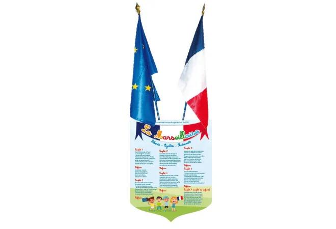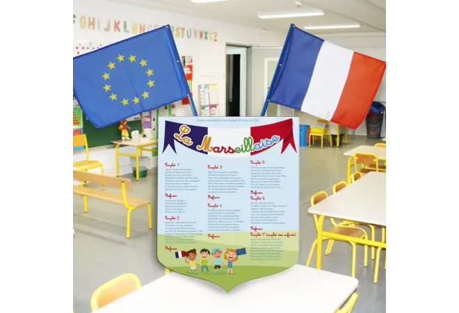 Écusson en PVC pour l'extérieur. À accrocher, selon la loi Peillon et la loi Blanquer, sur vos façades d'établissement, bien en vue. Les paroles de l'hymne national doivent être affichées dans chacune de vos classes.