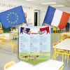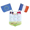 Un écusson au graphisme enfantin, adapté à l'âge scolaire des maternelles. Cet écusson comprend visuellement le drapeau tricolore, européen ainsi que la devise républicaine : Liberté, Égalité, Fraternité. Comme le demande la loi BLANQUER. Graphisme enfantin pour correspondre à la fréquentation de l'école maternelle.