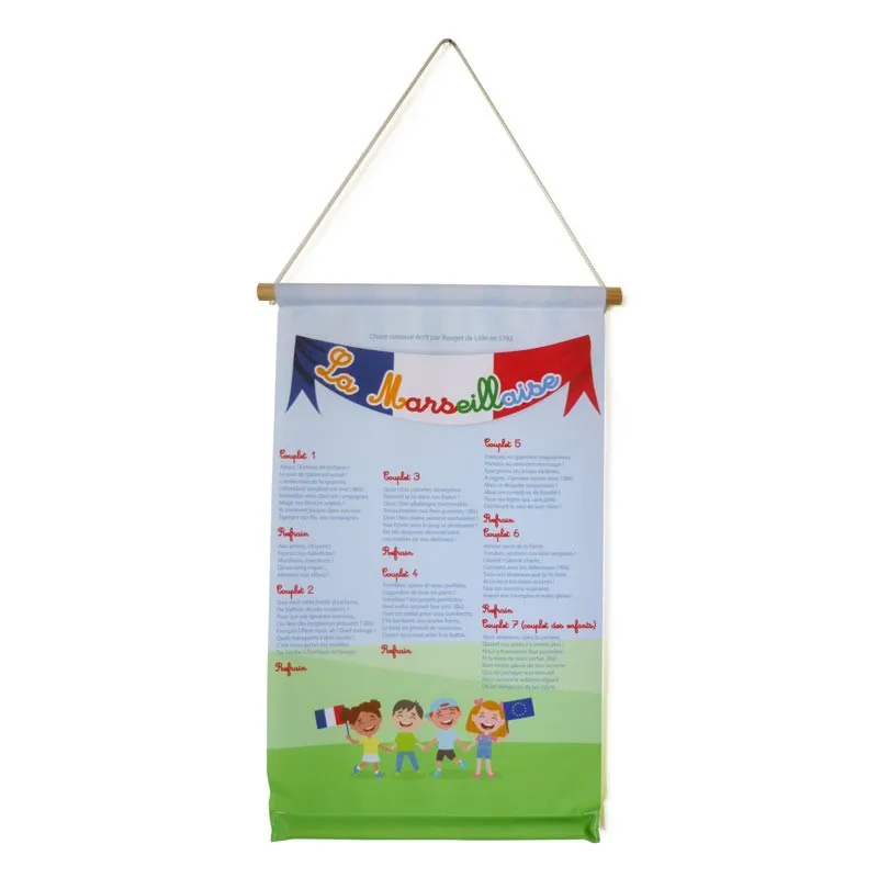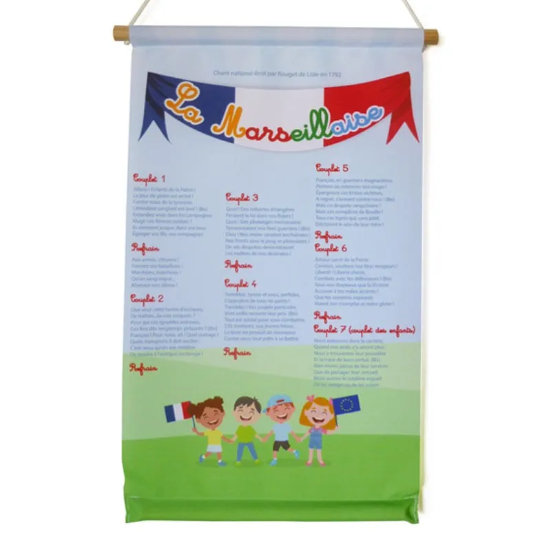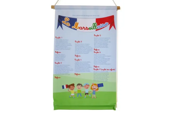 Un kakémono avec les paroles de la Marseillaise, pour afficher dans vos salles de classes et être en règle avec la loi Blanquer. Kakémono à suspendre, au format A3. (297 mm x 420 mm). En tissu Decotex.
