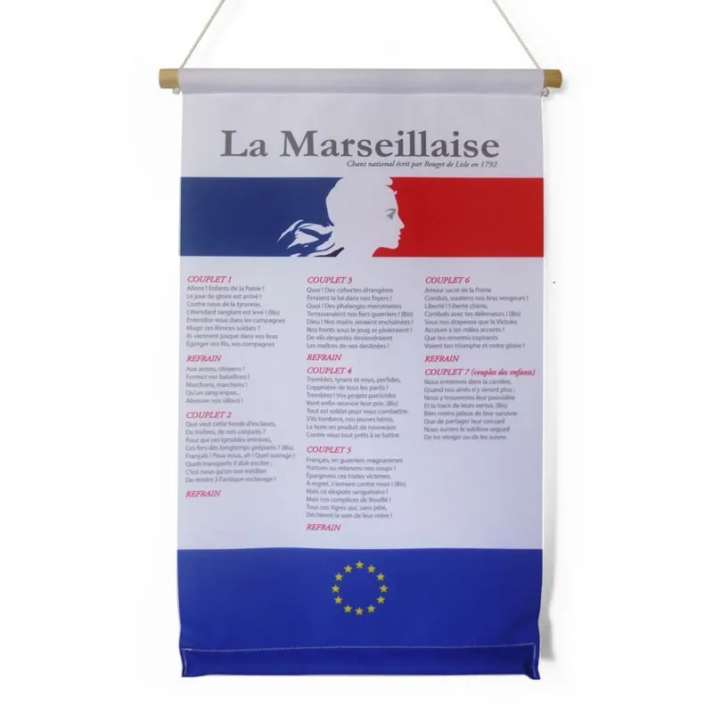 Un kakémono avec les paroles de l'Hymne National, pour votre salle de classe, niveau collège ou lycée. Kakémono en tissu Polyester (décotex). Affiche au format A3 (297 x 420 mm).