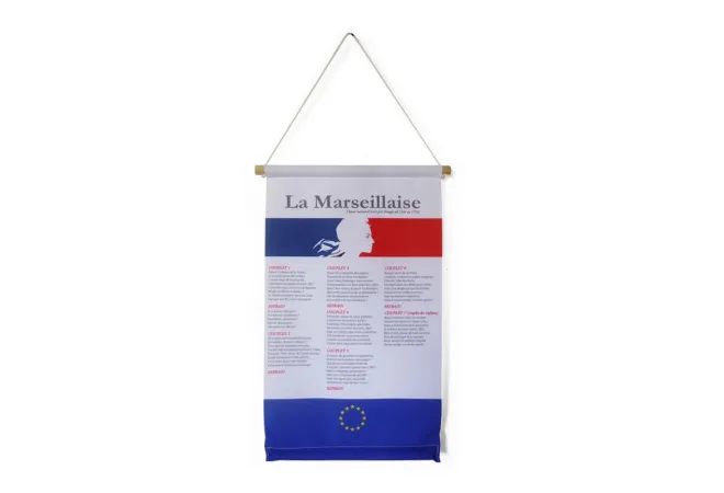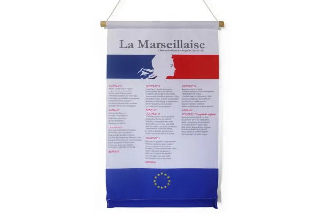 Ce kakémono répond à la loi Blanquer, qui demande aux institutions scolaires d'afficher dans leur salle de classe les paroles de l'Hymne national.