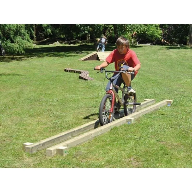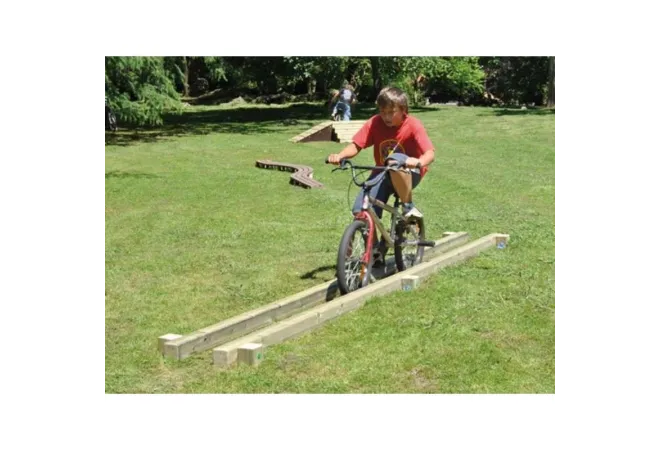 Le module VTT Passage d'équilibre met à l'épreuve l'habileté des cyclistes. Les amateurs de vélo peuvent s'entrainer à passer entre les deux rails pour améliorer leur agilité et leur équilibre. Vous pouvez créer un parcours sportif de VTT complet en installant à la suite d'autres modules issus de notre gamme.