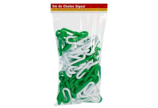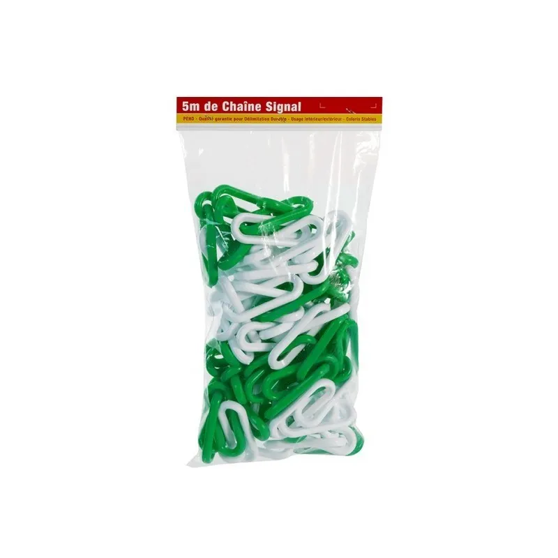 Sachet de 5 mètres de chaînette en plastique vert et blanc disponible en 3 diamètres. Cette chaîne de chantier verte et blanche est utilisable en intérieur et en extérieur.