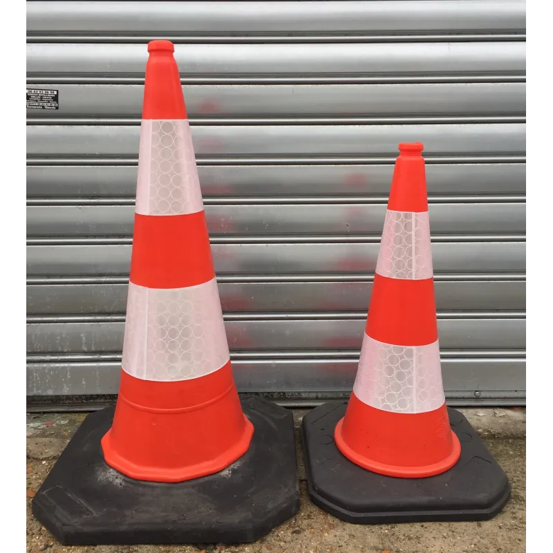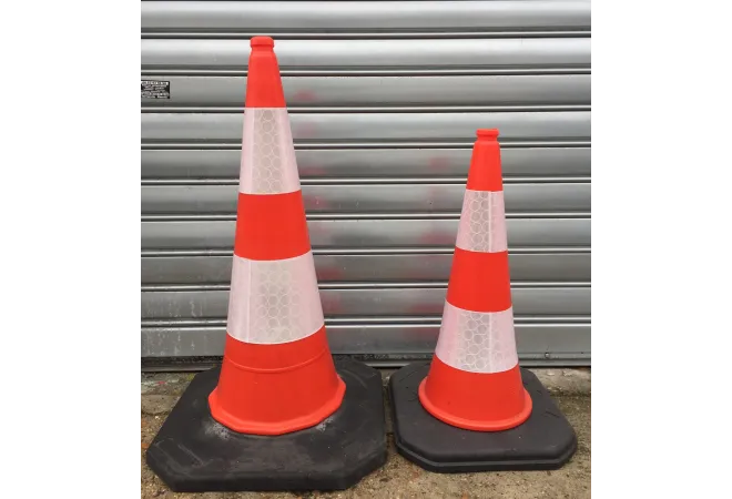 - Cône de chantier avec une base en caoutchouc recyclé et un cône en polyéthylène habillé de 2 colliers de film rétro réfléchissant classe 2