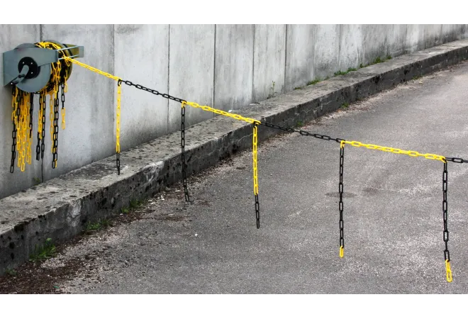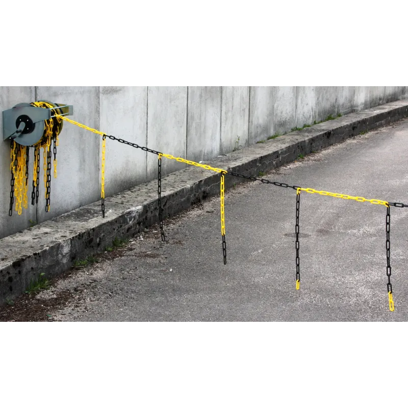 Dérouleur mural de chaîne plastique jaune et noir permettant de barrer rapidement un accès. Enroulez et déroulez la chaîne grâce à une manivelle.