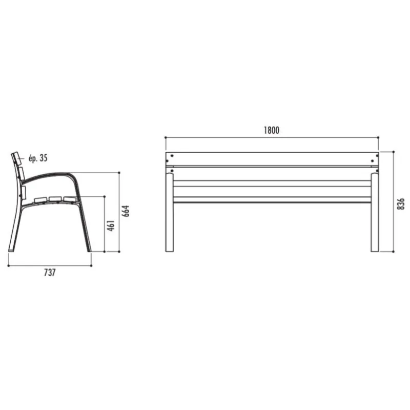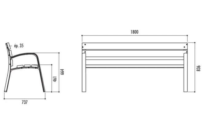 Les dimensions du banc Modo bois exotique sont : Longueurs : 1800 mm ou 3000 mm - Hauteur totale : 836 mm - Hauteur d'assise : 461 mm ou 450 mm - Hauteur des accoudoirs : 664 mm - Profondeur totale : 737 mm - Entraxe de piétement : 1738 mm ou 2 x 1464 mm - Poids : 60 ou 128 Kg. Le modèle du banc public Modo existe également en version banc public lames de pin, en version lames en bois technique, en banc urbain en métal ou en banc public en polyéthylène, Leader Equipements vous recommande ce banc pour tous vos projets d'aménagement urbain.