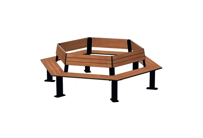 Le banc tour d'arbre hexagonal permet d'aménager des aires de repos ombragées tout en protégeant les arbres. Composé de piétements carrés en acier qui lui procurent robustesse et stabilité, et d'assises et dossiers en stratifié compact déclinables en 3 teintes. Il trouvera sa place dans les parcs et jardins publics, dans les cours d'école et même dans les galeries marchandes.