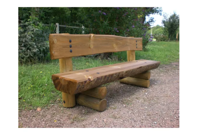 Banc en bois certifié PEFC, modèle Limoges, le banc est conçu avec un demi-rondin pour l'assise et de plus petits rondins pour le piétement, un dossier fait d'une belle planche massif. Un banc très solide résistant très fortement aux intempéries grâce à son traitement autoclave de classe IV. Banc pour collectivités fabriqué en France.