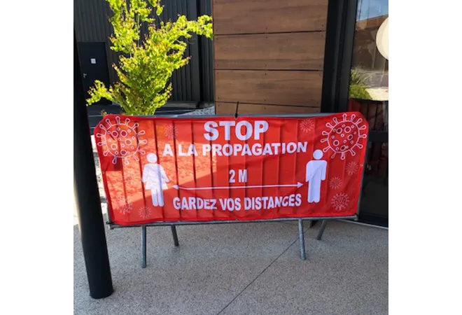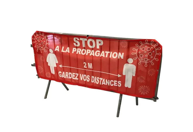 Une cache barrière en tissu avec un message d'alerte clair pour respecter une distance entre les individus. Pendant le confinement et très surement par la suite, nous aurons besoin de rappeler à chaque individu l'importance de garder ses distances. Idéal pour les marchés, les bâtiments administratifs, les entreprises, les supermarchés. Faire barrage au Covid 19 et limiter la transmission du virus.