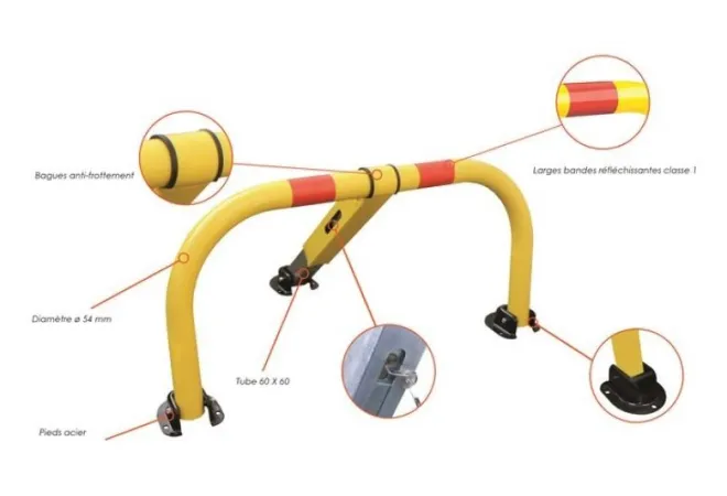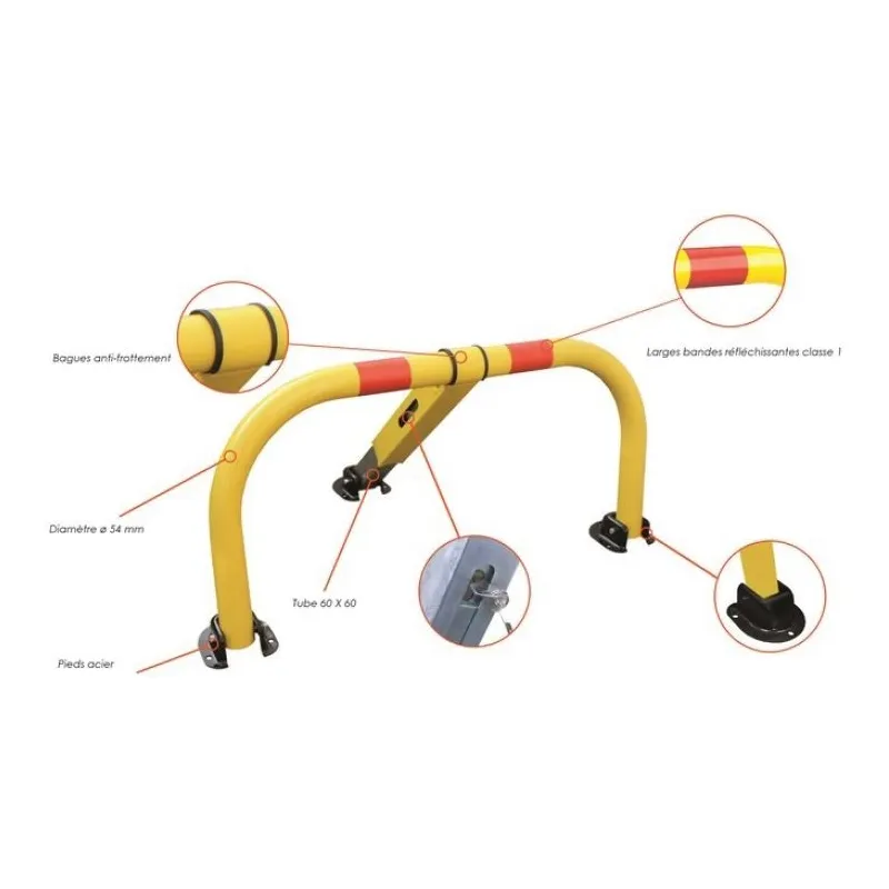 La finition époxy jaune assure une belle visibilité à cet arceau anti-stationnement. Une façon intéressante de délimiter une place de stationnement tout en la protégeant. Grâce à un système de verrouillage automatique manuel, cet arceau métallique pour parking se lève et se baisse facilement, dès que vos agents et usagers en ont besoin. Les bagues anti-frottement protègent les véhicules à chaque passage. Quant aux pieds en acier, ils garantissent une installation durable, malgré les passages répétés.