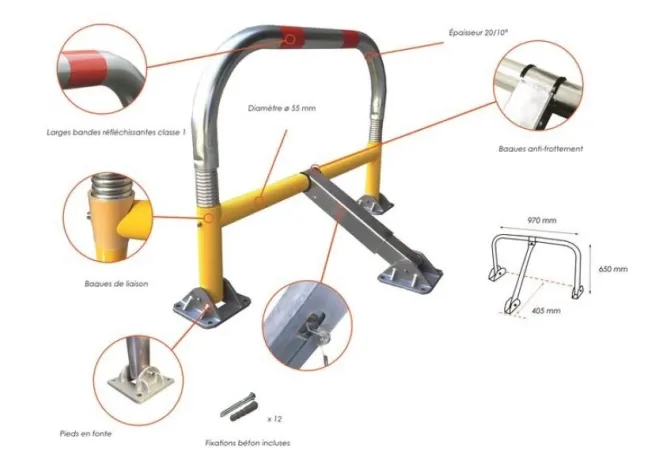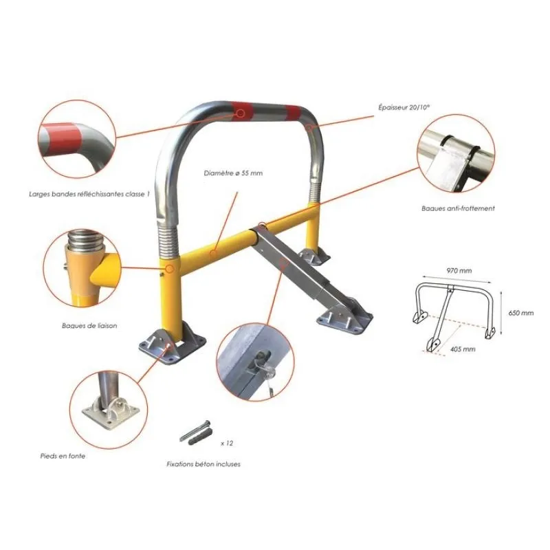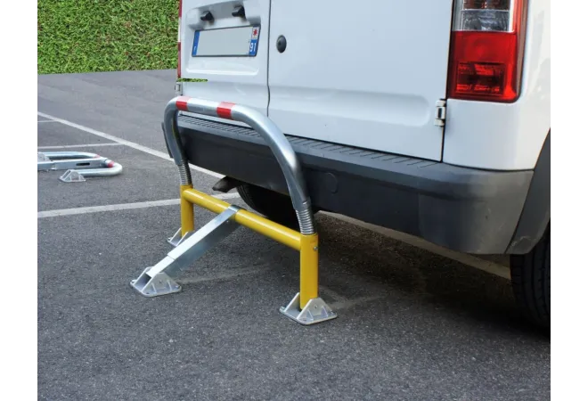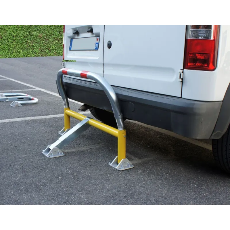 Pour protéger votre place de parking et éviter les stationnements interdits, le block parking haute résistance avec ressort est idéal. La conception en acier galvanisé de cet arceau de stationnement est complétée par des bandes réfléchissantes. Fixé au sol, cet arceau pour place de parking protège vos places ainsi que vos véhicules.