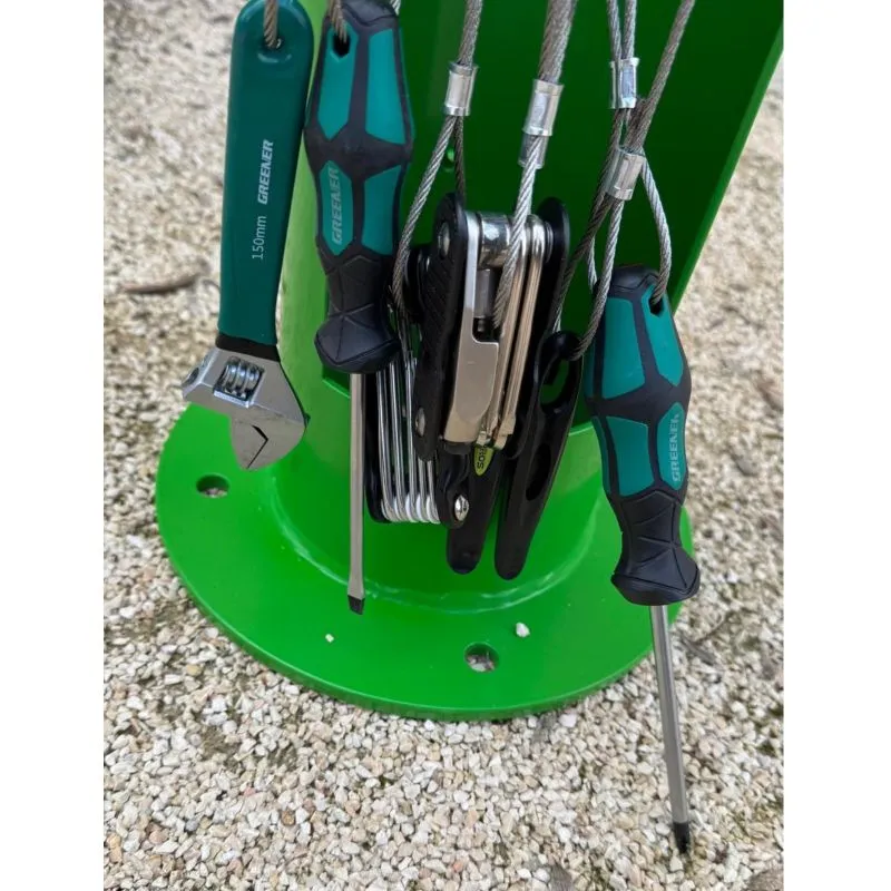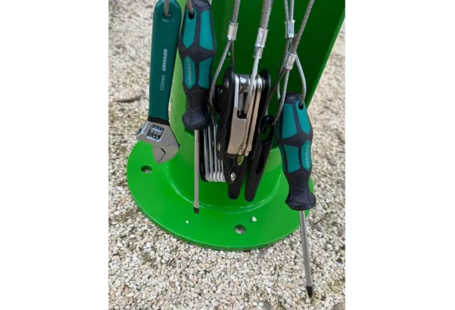 La station réparation vélo VELOREP'® offre un espace de travail fonctionnel avec la possibilité de suspendre deux vélos simultanément pour faciliter les réparations. Elle est équipée d'une gamme d'outils essentiels, solidement fixés par des câbles en acier pour éviter le vol et la perte :