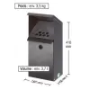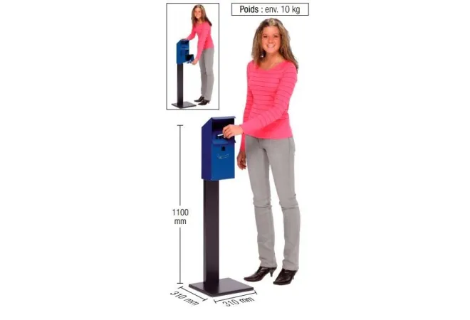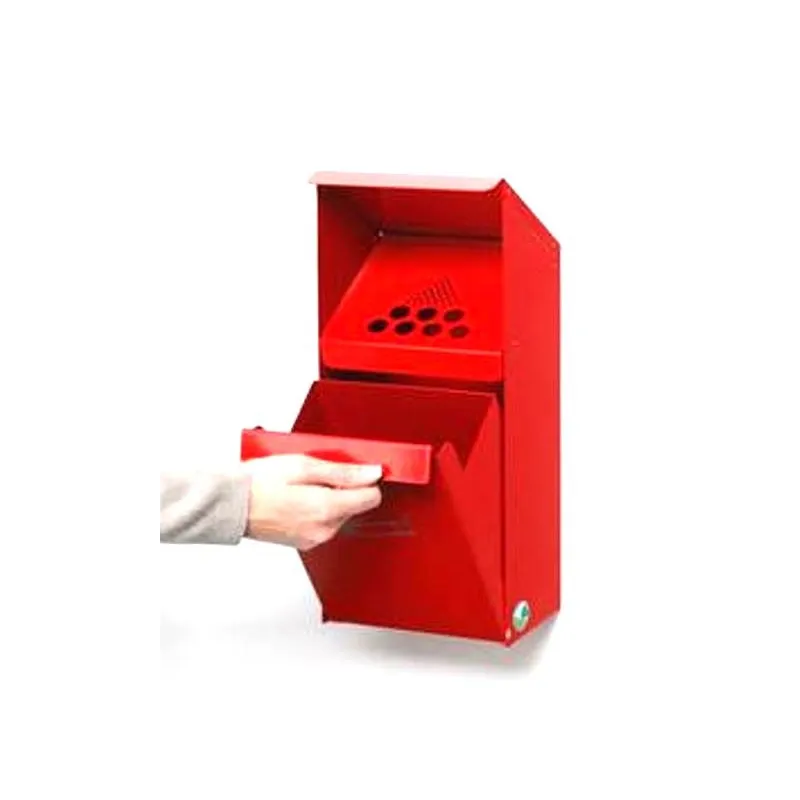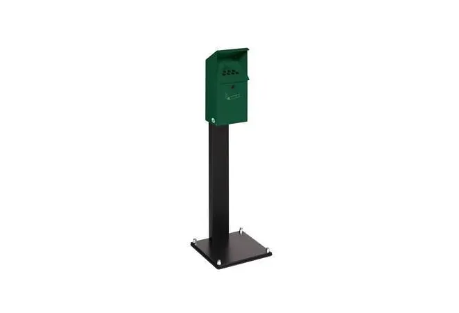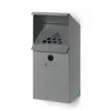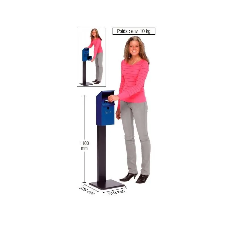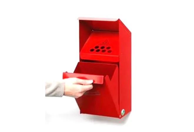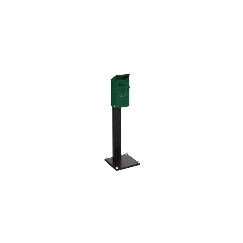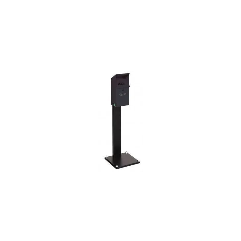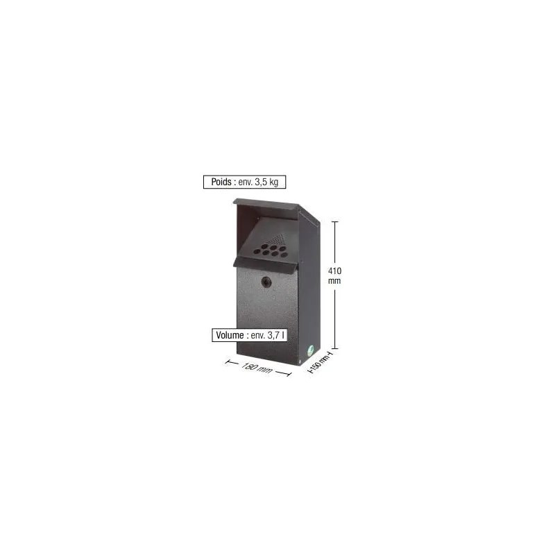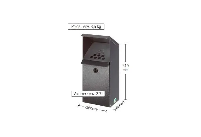 - Le cendrier est sécurisé par une serrure et une clé (fournie), vidage par basculement du clapet vers l'avant.Option : support en tôle d'acier galvanisé finition poudre polyester époxy cuite au four anti UV de haute qualité (toujours noir).