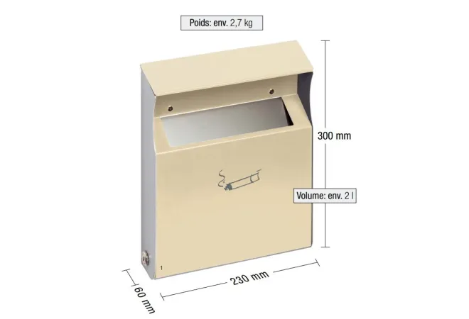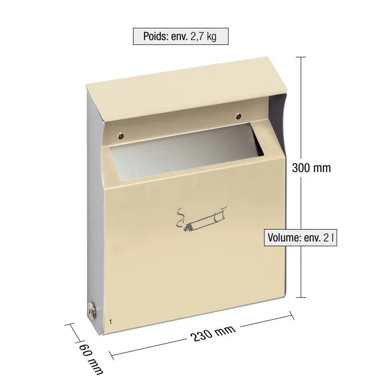 - Le cendrier est sécurisé par une serrure et une clé sécurisée (fournie). Pictogramme cigarette fourni.