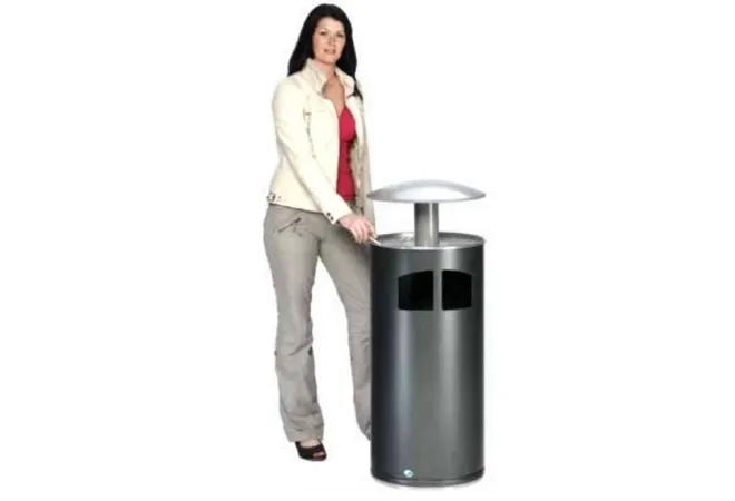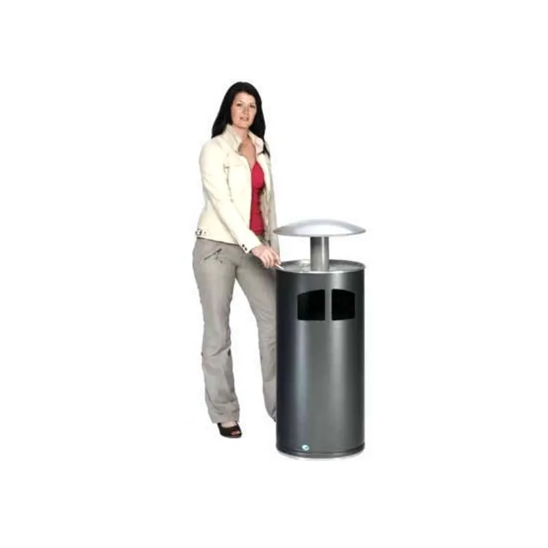 Cendrier avec poubelle en métal de forme ronde et avec toit pour collectivités, à installer en extérieur, élégant et pratique.