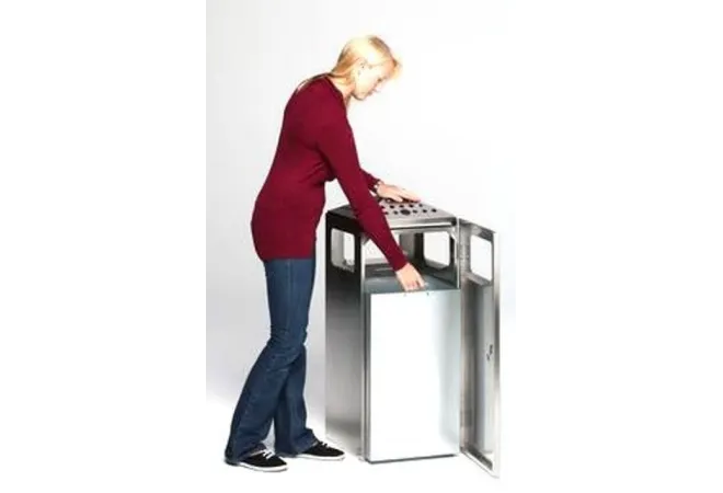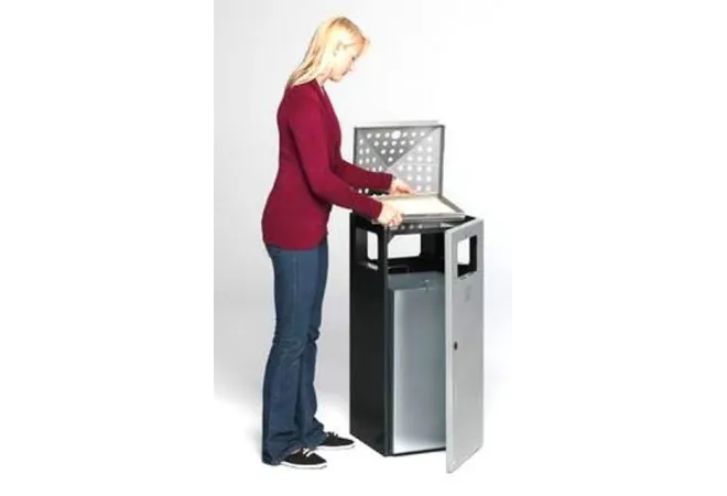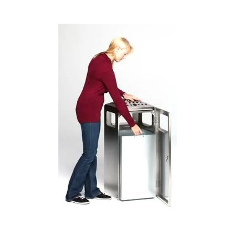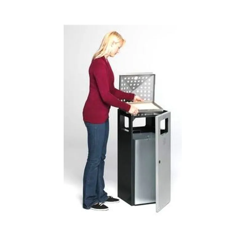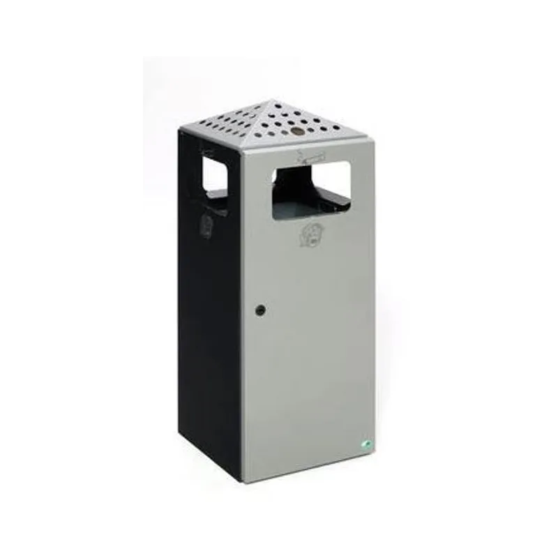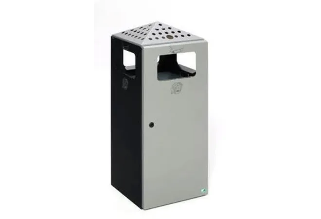Cendrier avec poubelle en métal de forme cubique pour collectivités, à installer en extérieur, élégant et pratique.