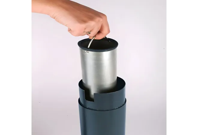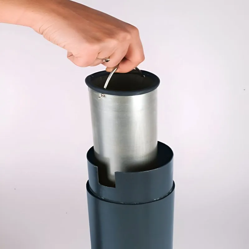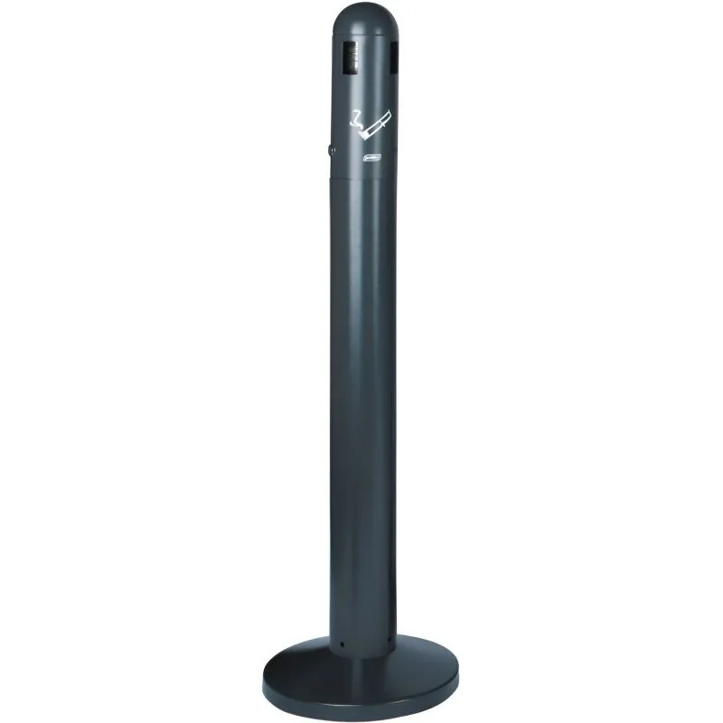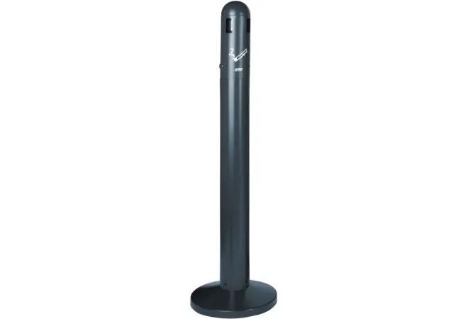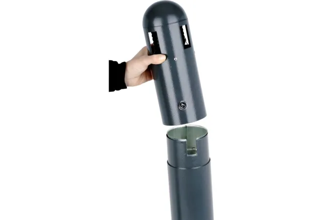 Le cendrier dome sur pied, d'une contenance de 3 litres, est fabriqué en acier galvanisé. Il est conçu pour limiter l'infiltration de l'eau de pluie. Équipé d'un entonnoir intérieur pour étouffer rapidement les émissions de fumée. Il est muni d'une plaque écrase mégots, d'un bac intérieur amovible et d'une serrure en inox. Fermeture par clé incluse et accès pour éteindre les mégots en 4 points. Sa finition époxy gris anthracite permet de le marier à tous les environnements.