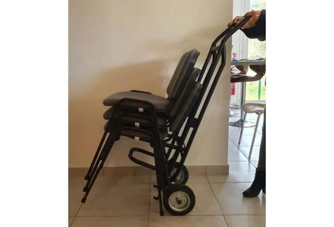 Le diable de transport PRATIC'DIABLE pour chaises empilables de collectivités vous permettra de transporter entre 10 et 15 chaises selon les modèles.