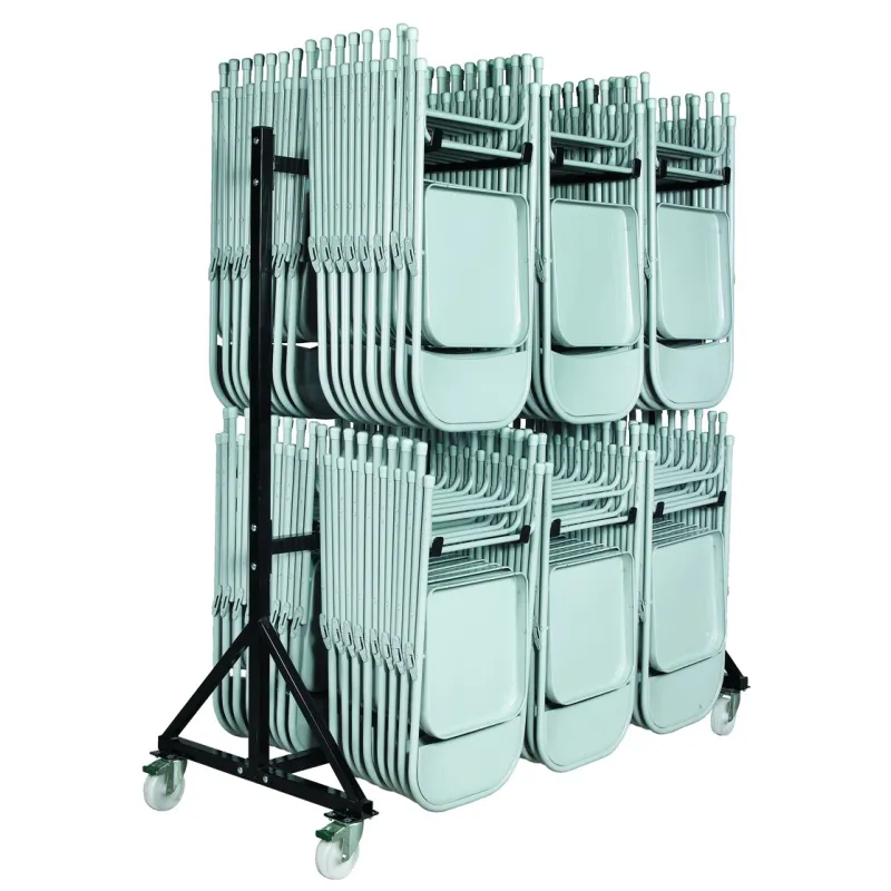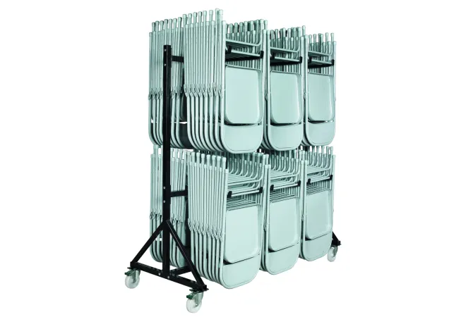 Ce chariot pour chaise pliante, dont la structure et les bras de suspension sont faits à partir de tubes en acier, existe pour différents types de chaises. Pratique avec ses 2 freins et ses 2 roues à fonction pivotante, ce chariot a roulette de couleur noire dispose également d'embouts antichute afin de garantir une sécurité maximale.
