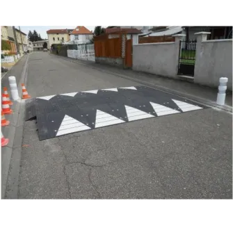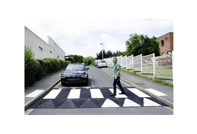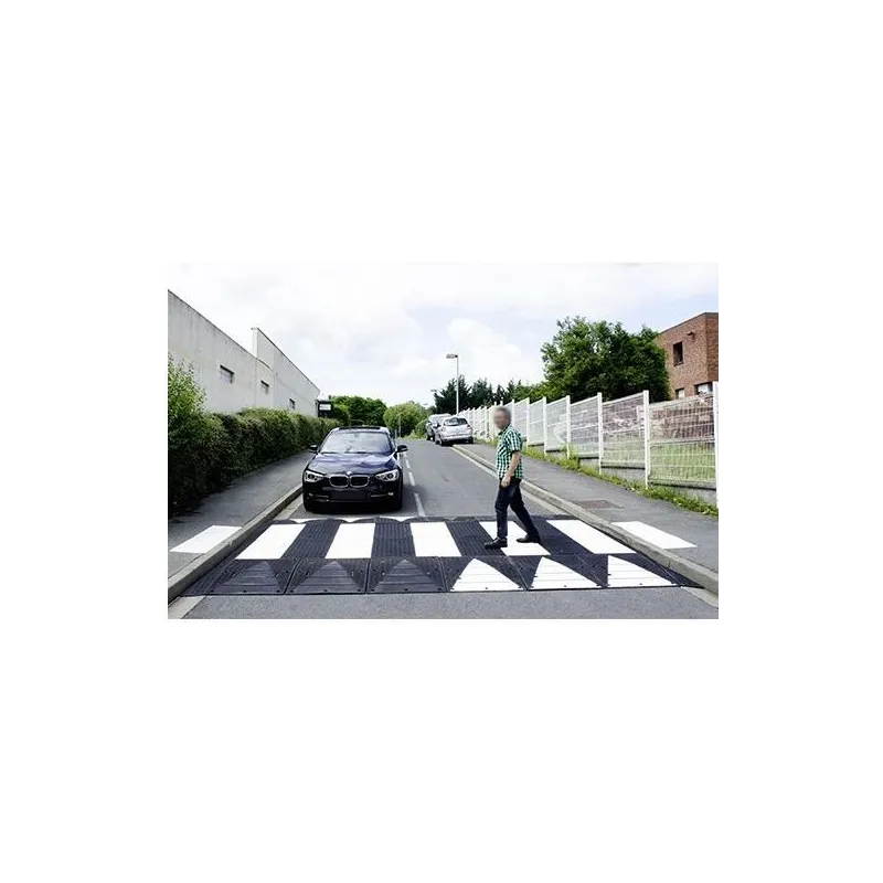 Dispositif visant à faire ralentir le trafic en agglomération, tout en matérialisant un passage piétons, Leader Équipements vous propose le plateau module passage piéton ralentisseur caoutchouc, conforme aux recommandations du CEREMA.