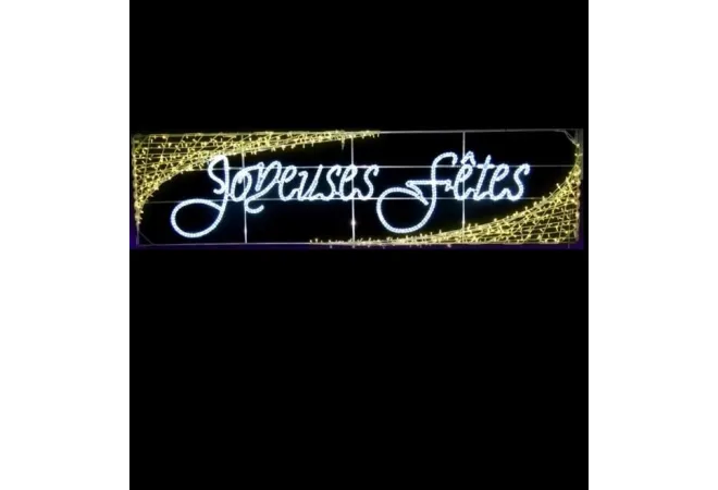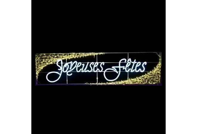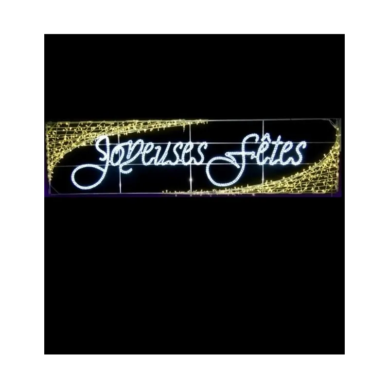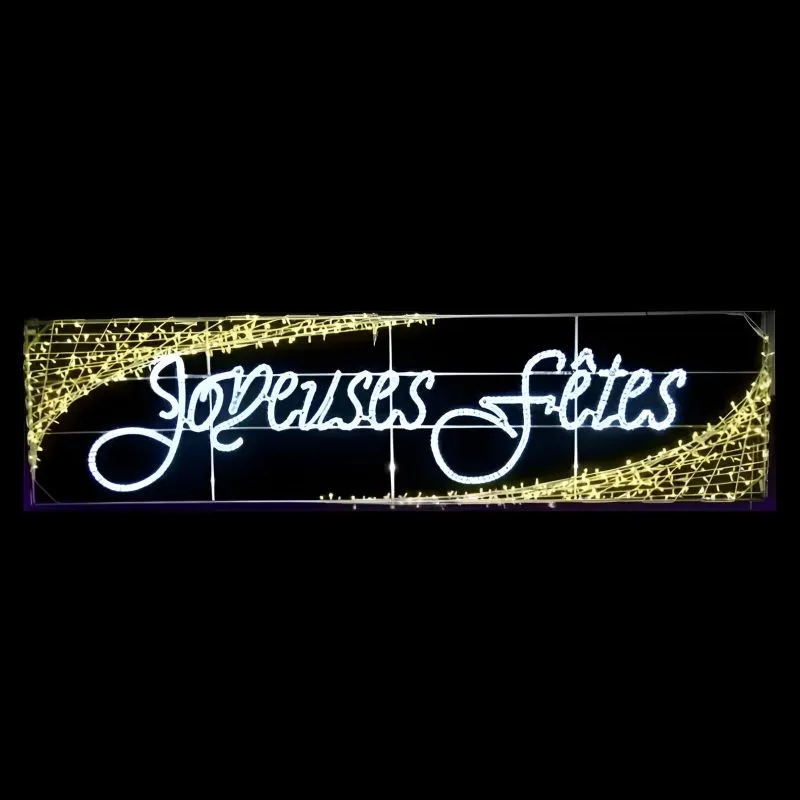 Leader Équipements, avec son décor lumineux à leds voûte de rue, vous propose de souhaiter aux habitants de votre commune de "Bons vœux" en lumière. La guirlande traverse de rue à suspendre à texte lumineux drapé "Joyeuses Fêtes" avec support est un décor parfait pour embellir vos rues le temps des fêtes de fin d'année. Vos rues sont transfigurées et changées en puits de lumière.