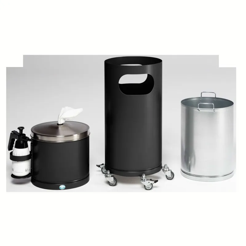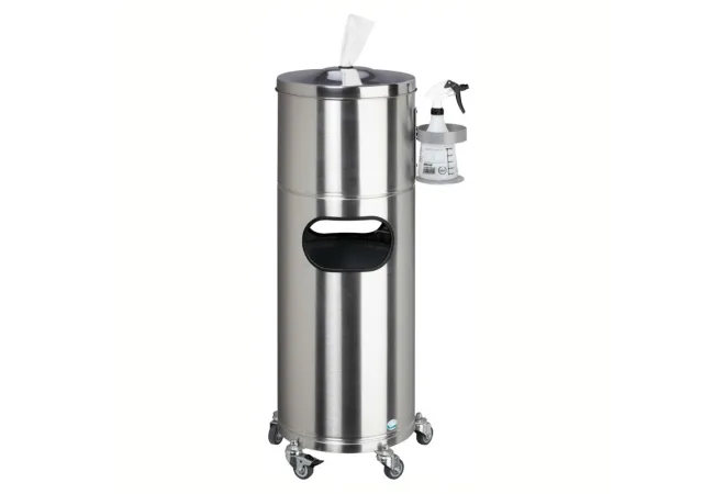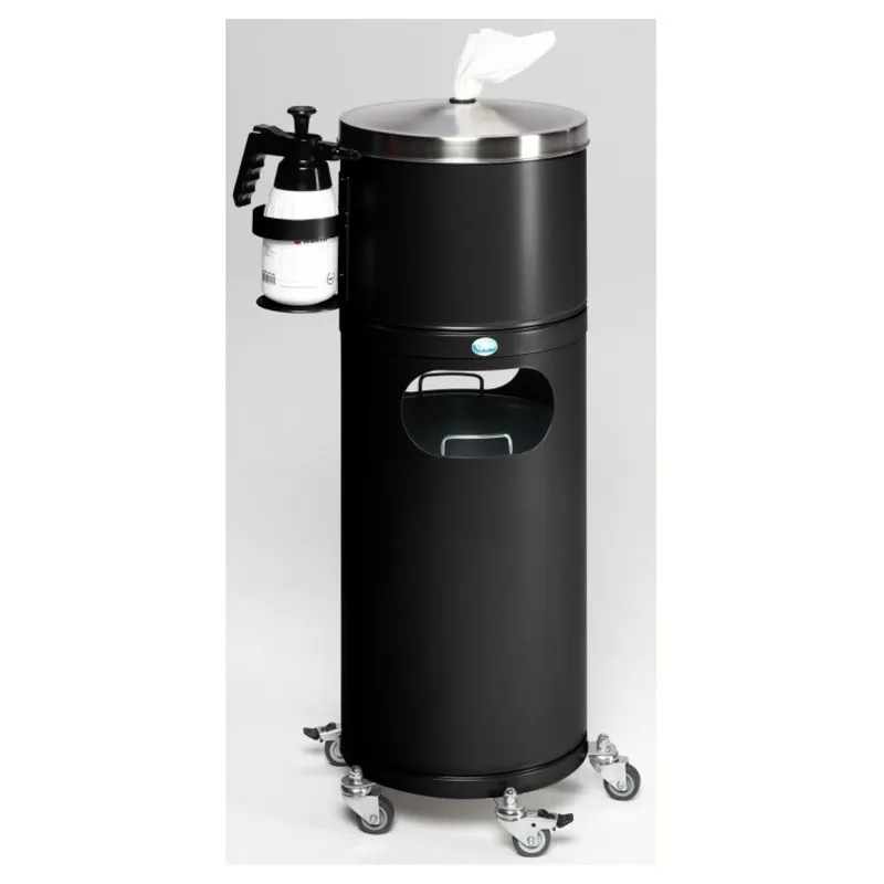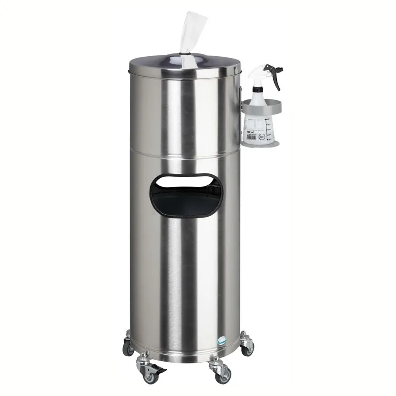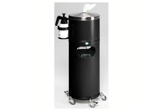 La station mobile pour désinfection de surfaces de travail est un appareil sur roulettes composée de 3 éléments. Une partie haute pour y loger un gros rouleau d'essuie-tout avec un distributeur sur le haut pour le passage du papier. Une partie basse qui contient le seau pour la poubelle. Cette station d'hygiène très pratique est idéale à mettre à disposition de votre personnel, afin qu'il contribue à la non-transmission du Covid 19 ou de la grippe.