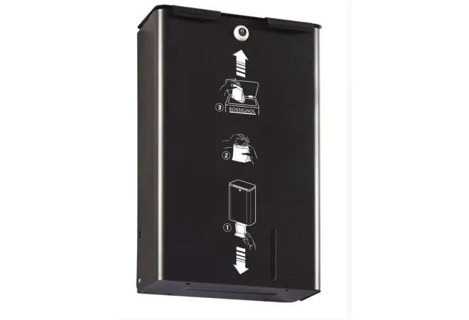 Le distributeur de sachets avec corbeille pour protections hygiéniques offre une solution pratique et résistante pour la distribution de 100 sachets en format plié et pré-coupé et d'une corbeille de format 10 Litres. Il s'installe facilement et dispose d'une serrure pour faciliter son remplissage par vos employés.