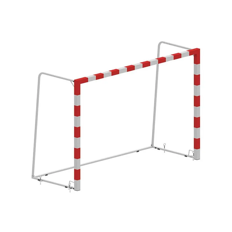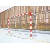But de handball peint en rouge et blanc. Le rouge n'est pas de l'adhésif ! Ce but est à sceller au sol. Le cadre est en acier galvanisé. La taille de ces cages est de 3 x 2 m.