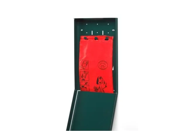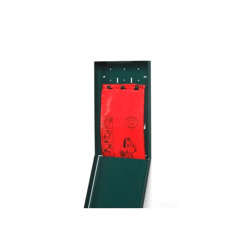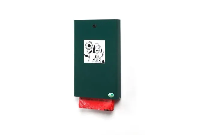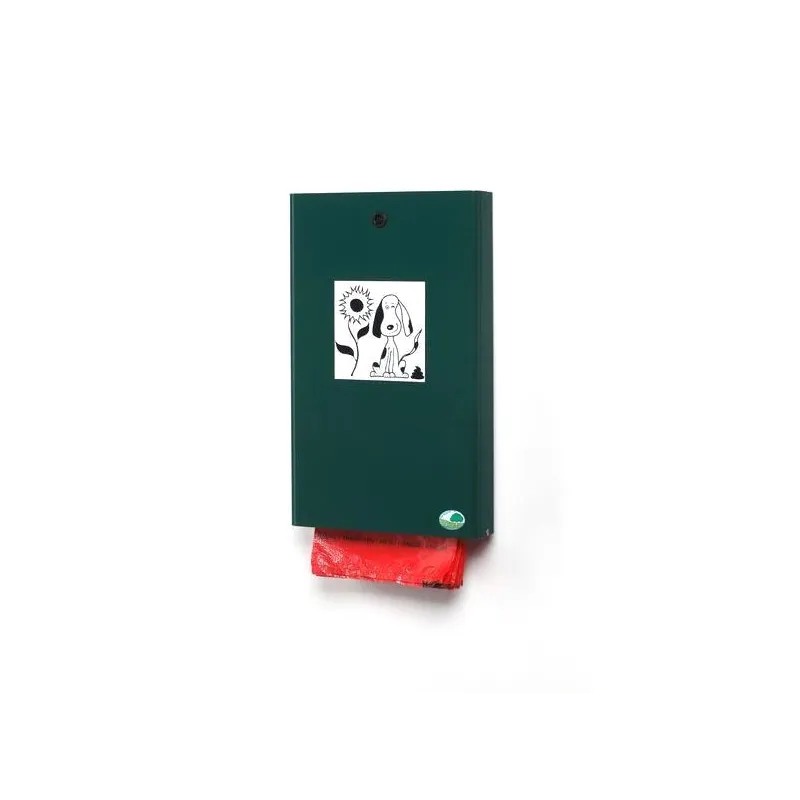 - Distributeur de sac pour déjections canines : tôle d'acier galvanisé et revêtement par poudre polyester époxy anti-UV RAL 6005 vert mousse