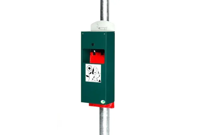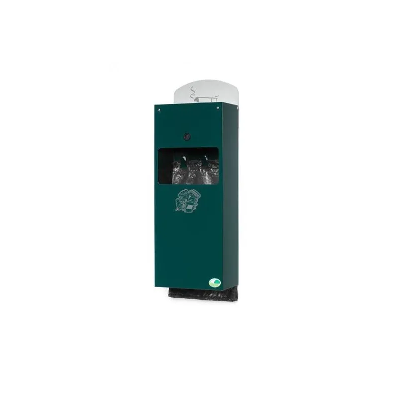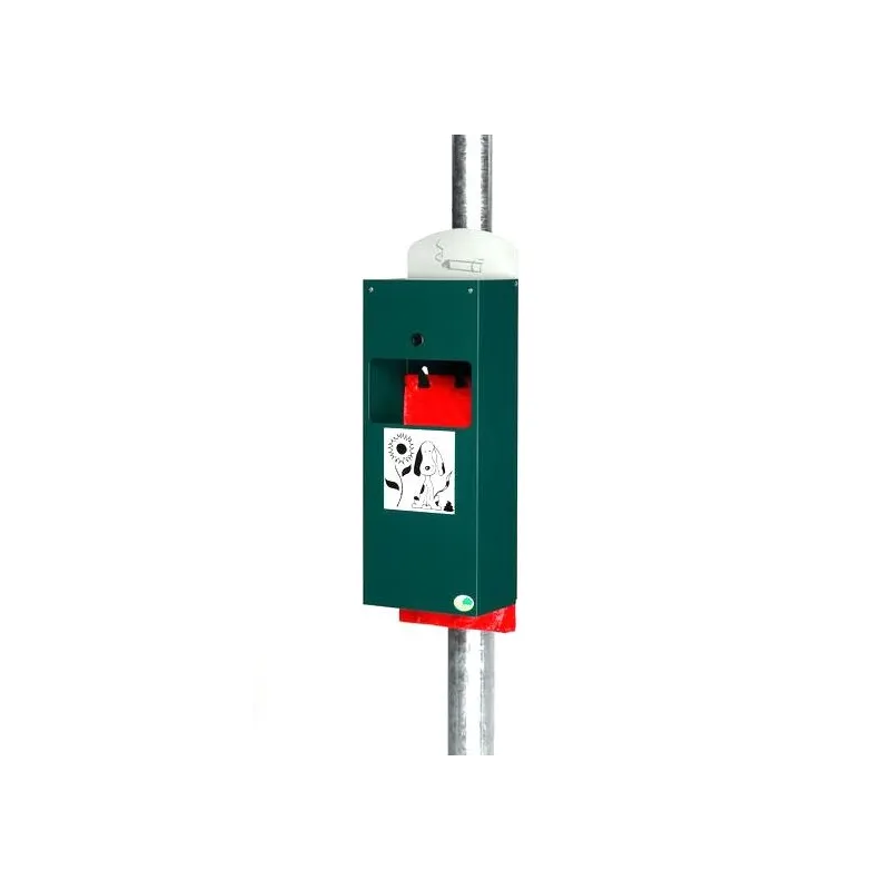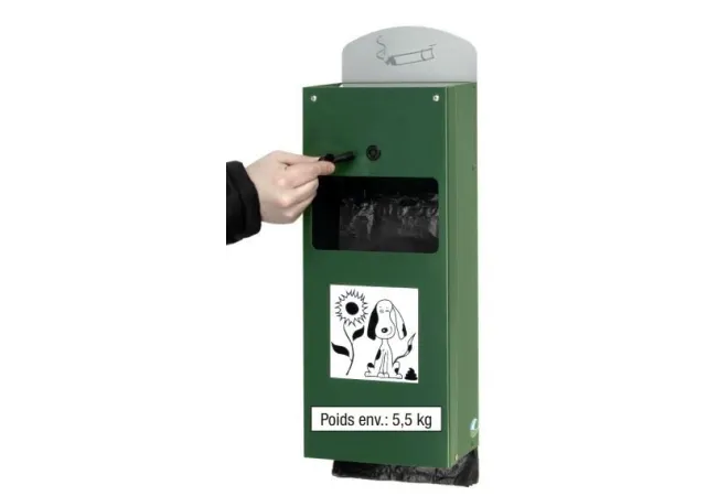 - Un distributeur de sac pour déjections canines : tôle d'acier galvanisé et revêtement par poudre polyester époxy anti-UV RAL 6005 ou Mica de fer