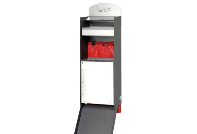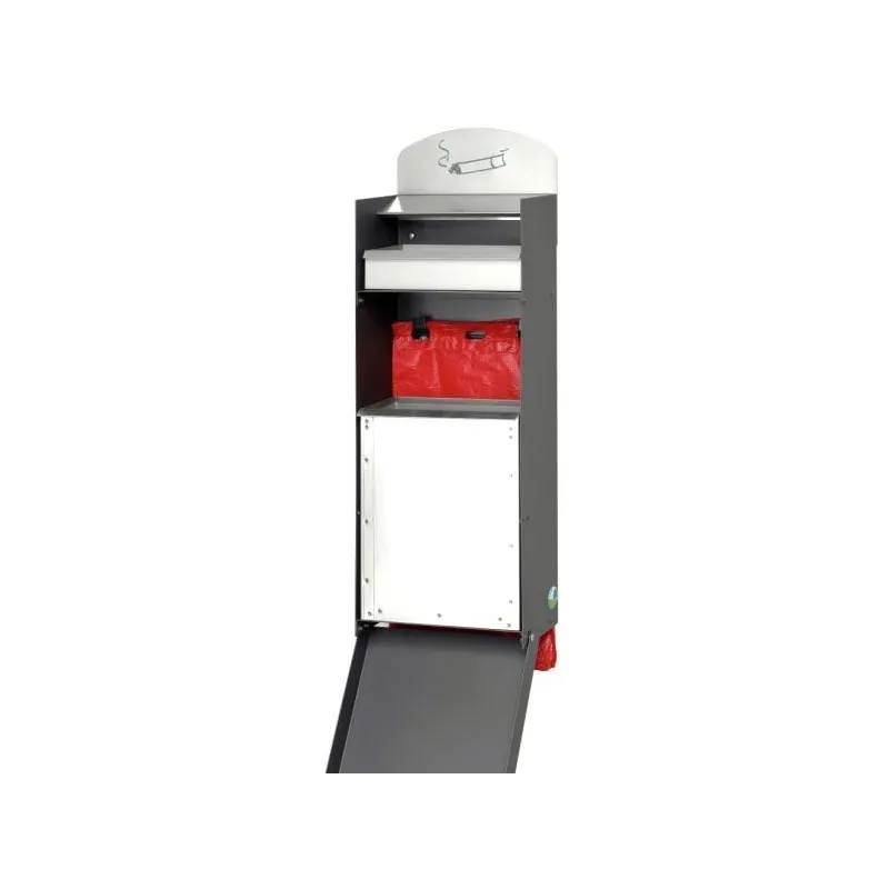 - Équipé d'une serrure triangulaire (1 clé) + 1 cendrier 0.8 Litre (+ panneau argenté avec pictogramme) + seau intérieur 4 Litres