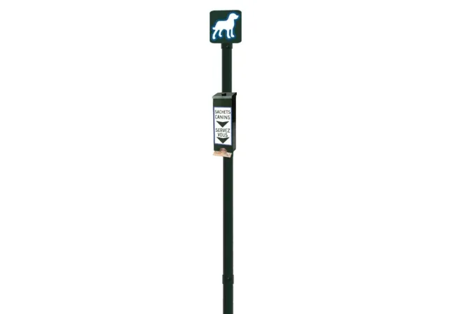 Une borne de distribution de sacs papier bio pour déjections canines. Peu encombrante et très efficace. Une borne en aluminium thermolaqué de couleur vert sapin pour s'intégrer facilement dans toutes les communes. À sceller au sol, cette borne accepte jusqu'à 100 sachets dans son distributeur. Netteté des rues et protection de la planète.