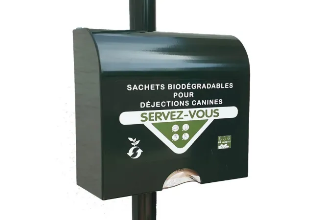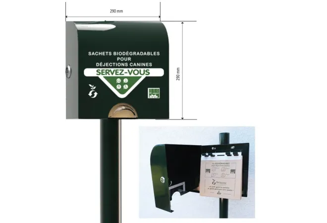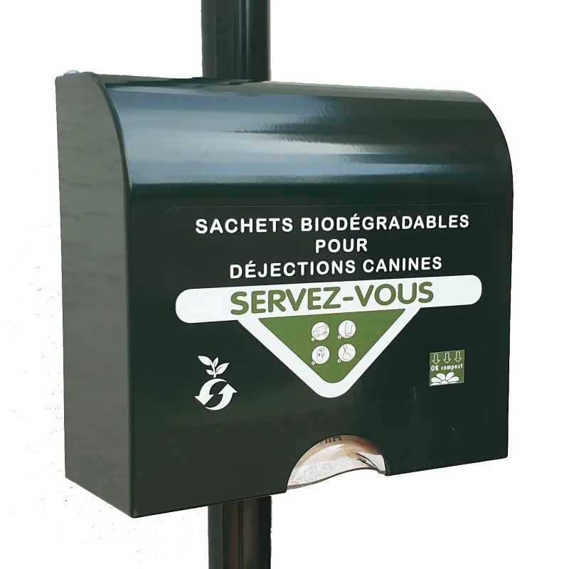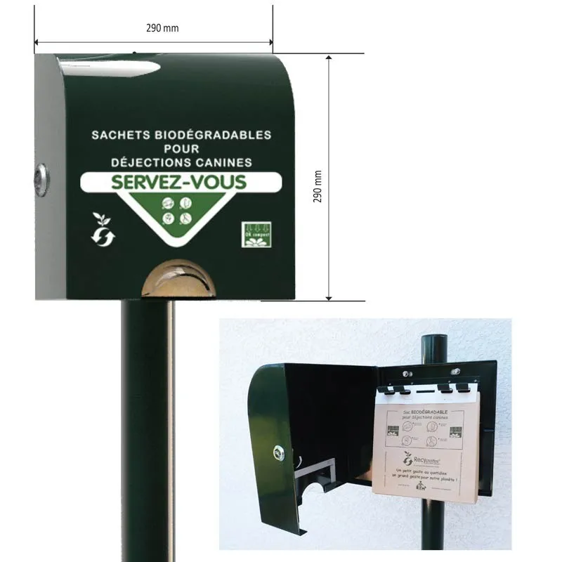 Ce distributeur pour hygiène canine de forme plutôt carré est fait pour la distribution de sachets en papier biodégradable et compostable. Il est fabriqué en aluminium thermolaqué ce qui fait qu'il résiste très bien à la corrosion et aux intempéries. Il possède un cache en plastique qui protège les sachets de la pluie et conserve ainsi toutes leurs qualités.