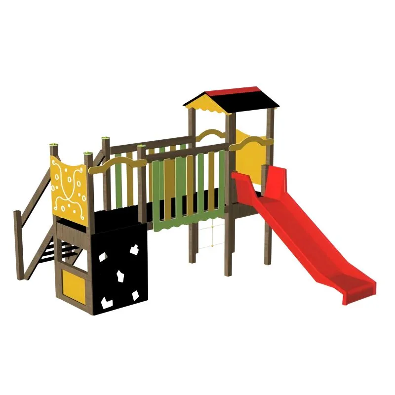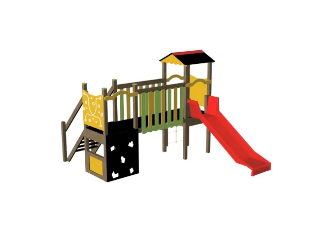 Une belle petite structure qui comprend plusieurs jeux en un seul module. En bois de pin traité autoclave pour une excellente durabilité dans le temps. Les enfants auront le choix d’une multitude de jeux présents sur ce module comme le toboggan avec un accès par escaliers adapté à leur âge ou par cordage, une passerelle d’accès au toboggan, un petit mur d’escalade qui donne également accès à l’escalier…