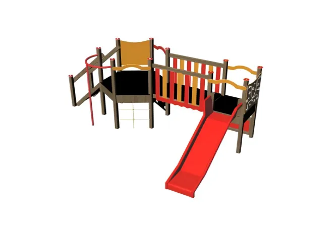 Une structure de jeux en bois conçus pour les enfants de 2 à 6 ans. Un accès au toboggan par escalier pour les plus petits et un autre accès par cordage pour les plus avertis. Le toboggan est en fibre de verre travaillée pour une glisse parfaite et une protection contre le soleil d’été, pour éviter les brûlures. Pour installer dans les aires de jeux publiques ou dans les écoles. Structure en bois de pin du nord traité autoclave pour durer très longtemps.