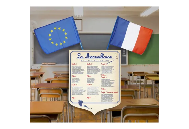"Apposition de la devise de la République et des drapeaux tricolore et européen sur la façade des établissements d'enseignement."