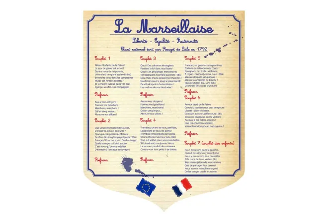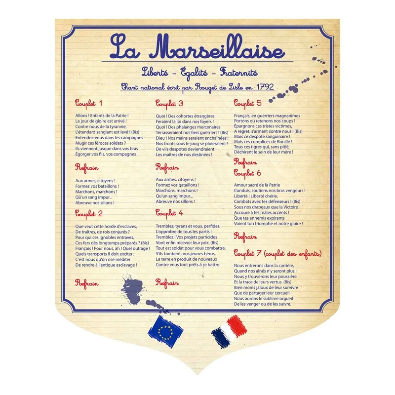 Écusson sur fond ivoire, avec une calligraphie enfantine. Pourra très bien convenir à une école, comme une école maternelle ou école primaire. Cet écusson trouvera sa place en façade à l'extérieur ou bien à l'intérieur, comme le préconise la loi Blanquer. L'affichage des paroles de "La Marseillaise" devra être affichée dans chaque classe du premier et second niveau.