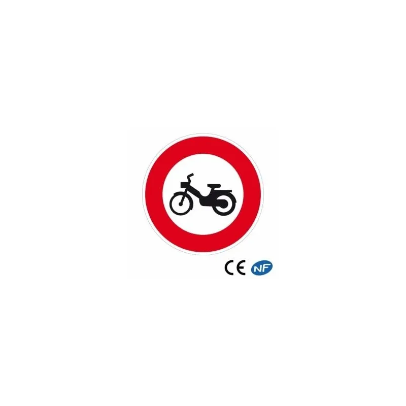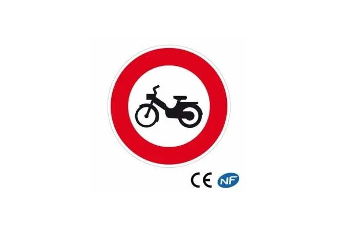 Panneau de circulation signalant un accès interdit aux cyclomoteurs (B9g). Panneau routier conforme aux normes en vigueur et de fabrication française. Il possède à son dos des rails raidisseurs qui le solidifie encore plus. Il est également doté d'un système de réglage latéral qui permet de l'installer partout sans difficulté même dans des zones difficiles comme certaines zones urbaines.