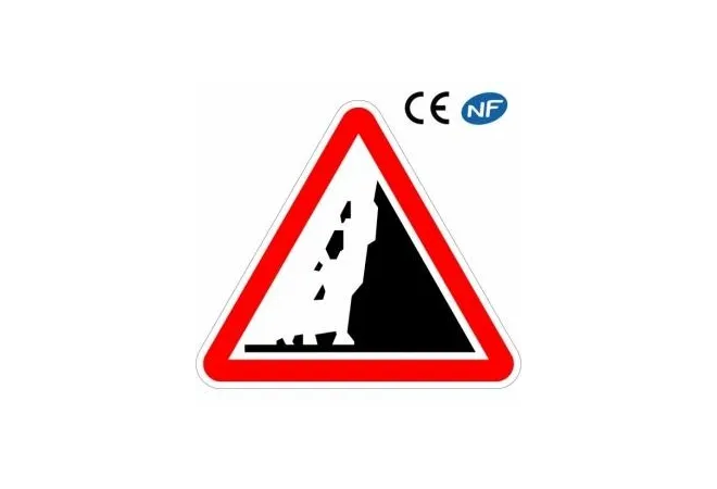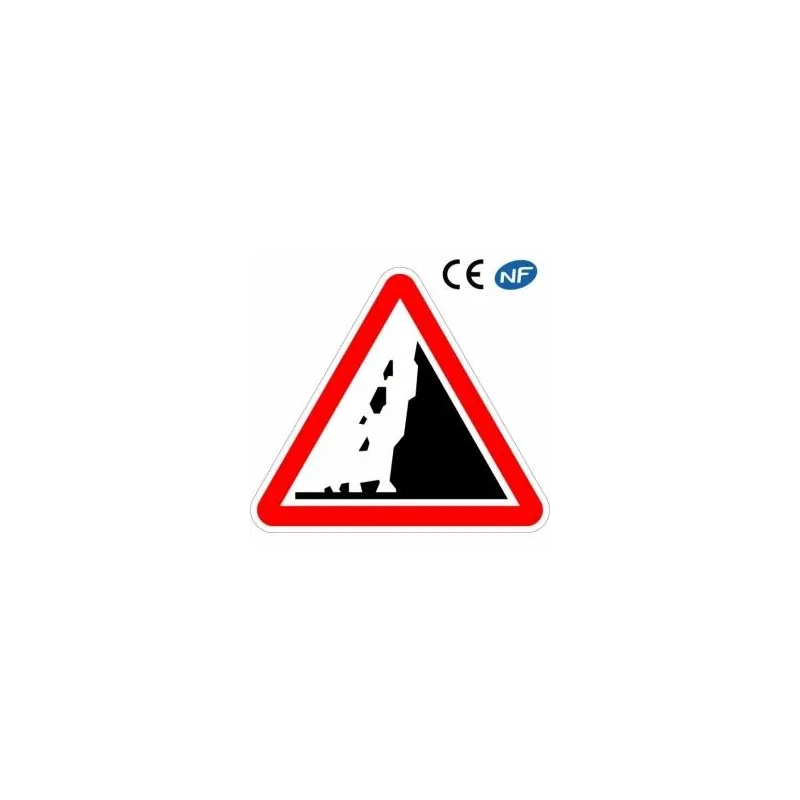 Un panneau routier pour les collectivités. Panneau de circulation signalant une zone à risque de chutes de pierres (A19). En aluminium avec 3 dimensions au choix et 2 classes de visibilité. Ce panneau pourra être vu à une distance de 80 m ou 250 m selon le film auto-réfléchissant choisi.