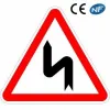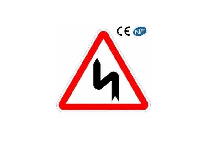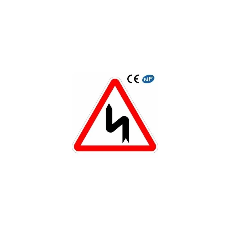 Panneau en aluminium indiquant un danger à l'approche d'une succession de virages dont le 1ᵉʳ est à gauche (A1d). Panneau respectant les normes françaises et européennes et fabriqué en France. Son profil d'entourage et ses rails raidisseurs lui apporte une très grande résistance.
