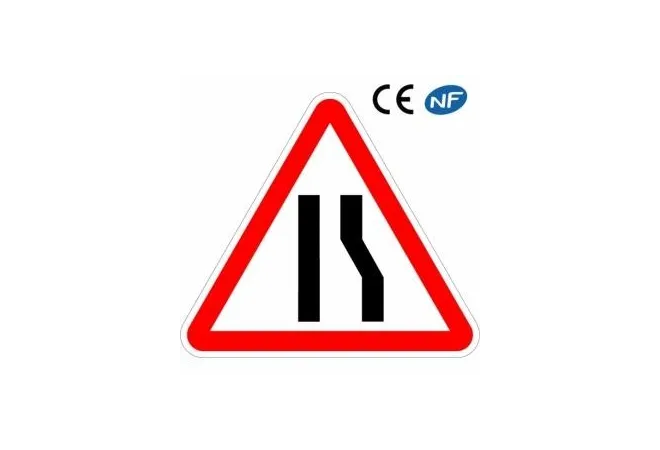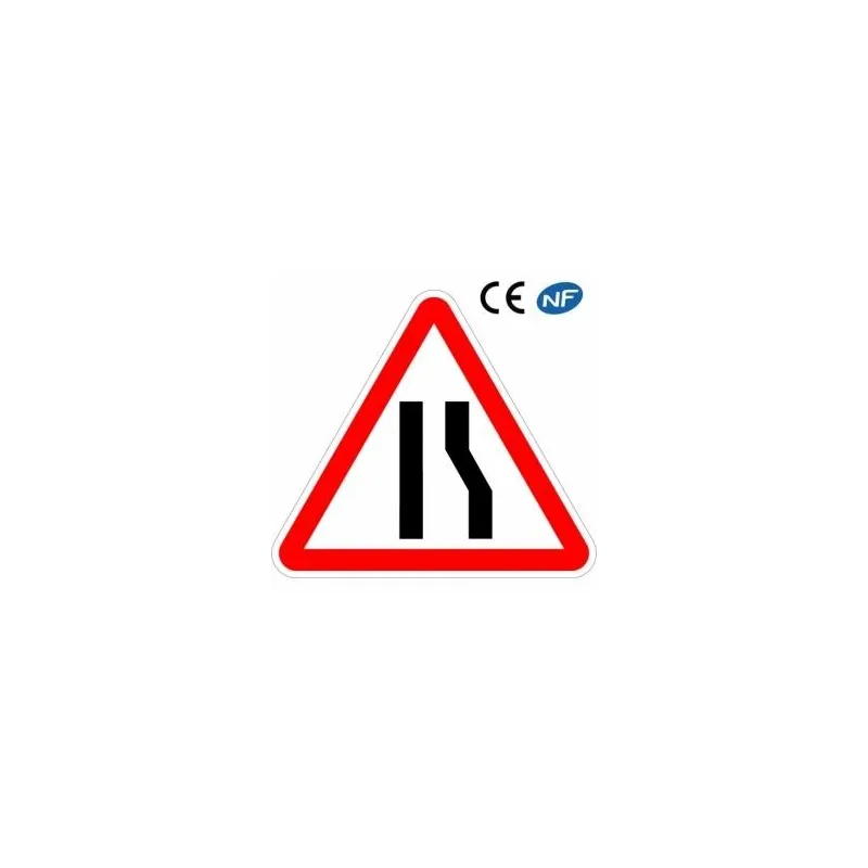 Panneau de circulation pour les collectivités. Panneau en aluminium indiquant un rétrécissement de chaussée par la droite (A3a). Disponible en 3 dimensions : 500 mm, 700 mm et 1000 mm et 2 classes de visibilités : classe 1 pour être vu à 80 m et classe 2 pour être vu à 250 m.