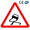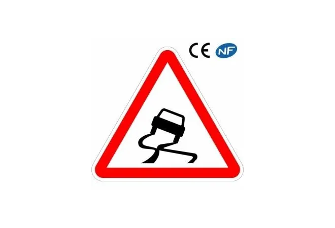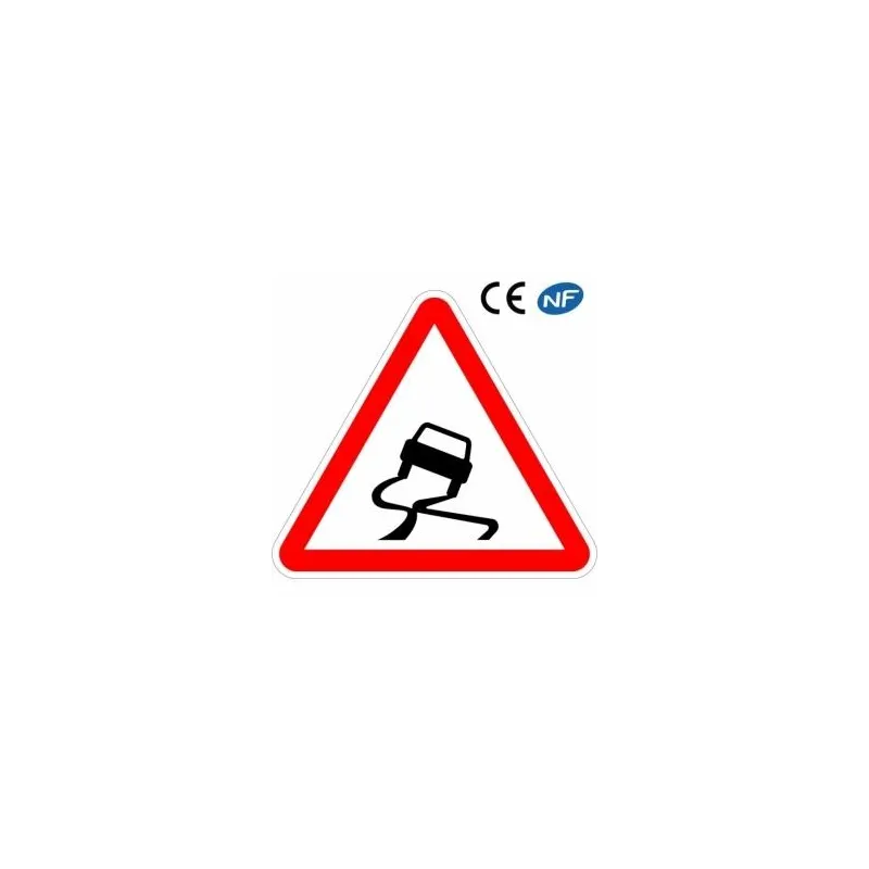 Panneau de circulation indiquant une chaussée particulièrement glissante (A4). Panneau pour collectivité respectant les normes françaises et européennes en vigueur. Disponible en 3 dimensions et 2 classes de visibilité aux choix.