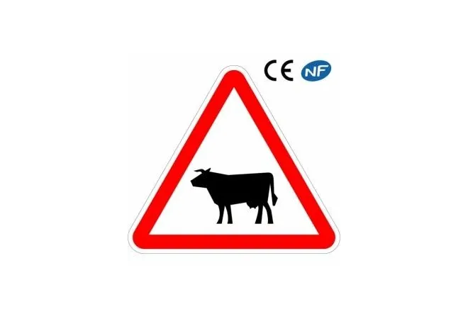 Panneau de signalisation pour signaler un passage d'animaux domestiques (A15a1). En aluminium très léger, ce panneau routier a été fabriqué en France. Il respecte les normes françaises et européennes. Bord du panneau sécurisé afin d'éviter les coupures aux mains lors de la manipulation.