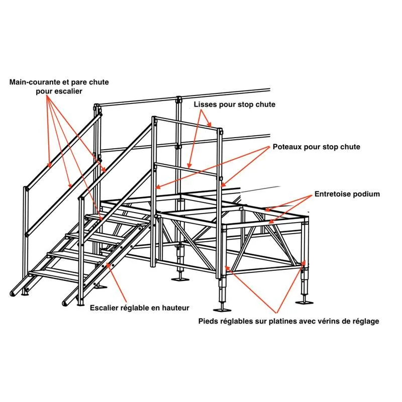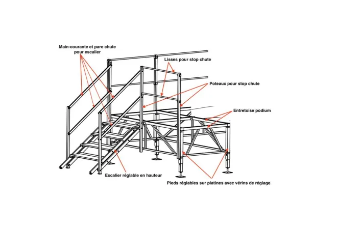 - Escalier réglable : s’ajuste automatiquement à la hauteur du podium avec main courante et 2 stop chutes
