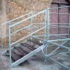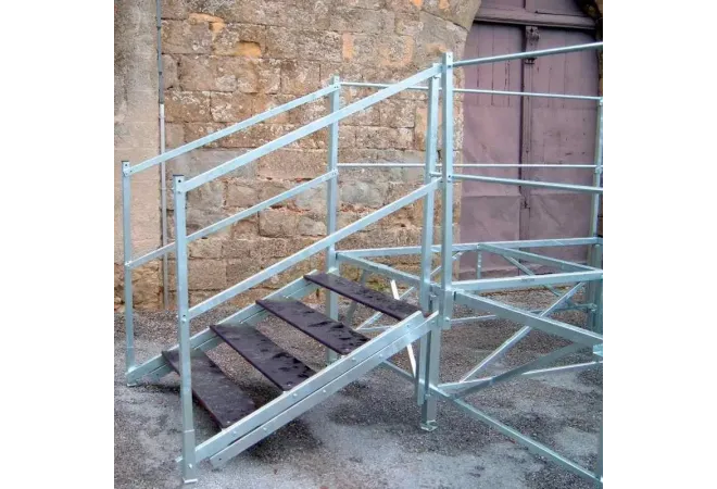 - Escalier réglable : s’ajuste automatiquement à la hauteur du podium avec main courante et 2 stop chutes