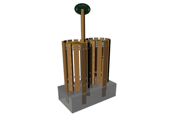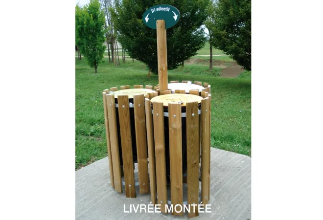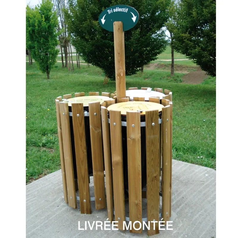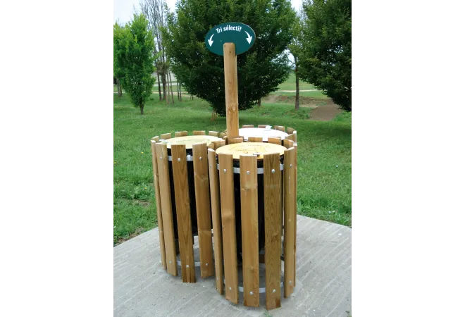 Corbeilles en bois cylindriques, pour tri sélectif. Lot de 2 ou 3 corbeilles. Les couvercles sont en matériau Compact et sont gravés d'un motif. La contenance pour ces corbeilles est de 100 litres par corbeille.