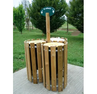 Poubelle extérieure disposant d'un entourage en lattes de bois résineux traitées autoclave certifiées Classe 4. Cette poubelle urbaine est composée d'un poteau rond à sceller, d'un support sac-poubelles avec couvercle et entourage en bois.