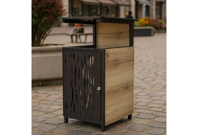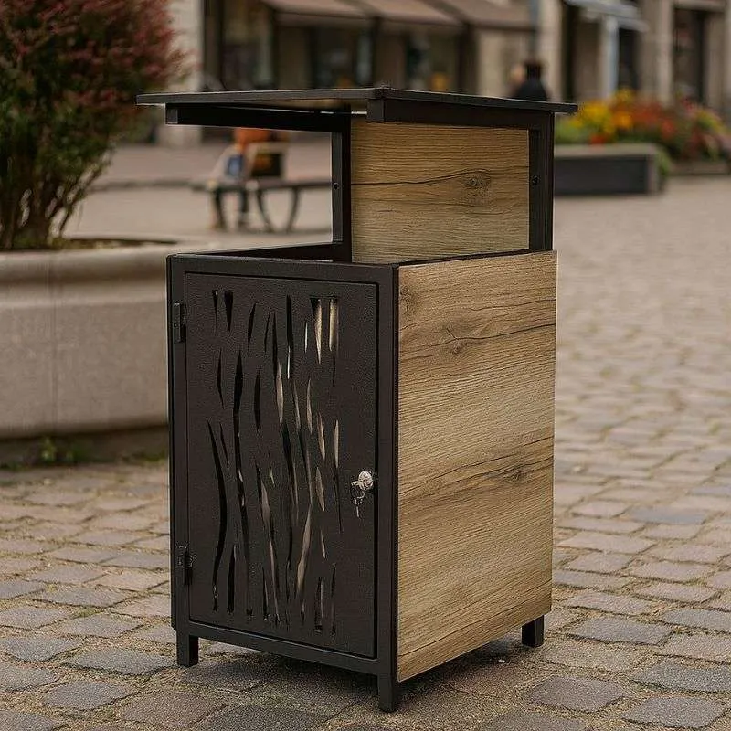 La poubelle extérieure avec toit Urba, équipée d'un porte-sac et d'une capacité de 60 litres, est conçue en acier traité anti-corrosion. Son revêtement de peinture thermolaquée, disponible en gris anthracite ou corten/terracotta, offre une résistance aux rayons UV et aux intempéries. Agrémentée de motifs métalliques ajourés découpés au laser et de panneaux en HPL, elle ajoute une touche d'élégance et de modernité. Son toit assure un écoulement efficace de la pluie. Fonctionnelle et esthétique, la corbeille de rue Urba est adaptée aux espaces extérieurs. Sa robustesse et son design soigné contribuent à maintenir la propreté des environnements urbains.